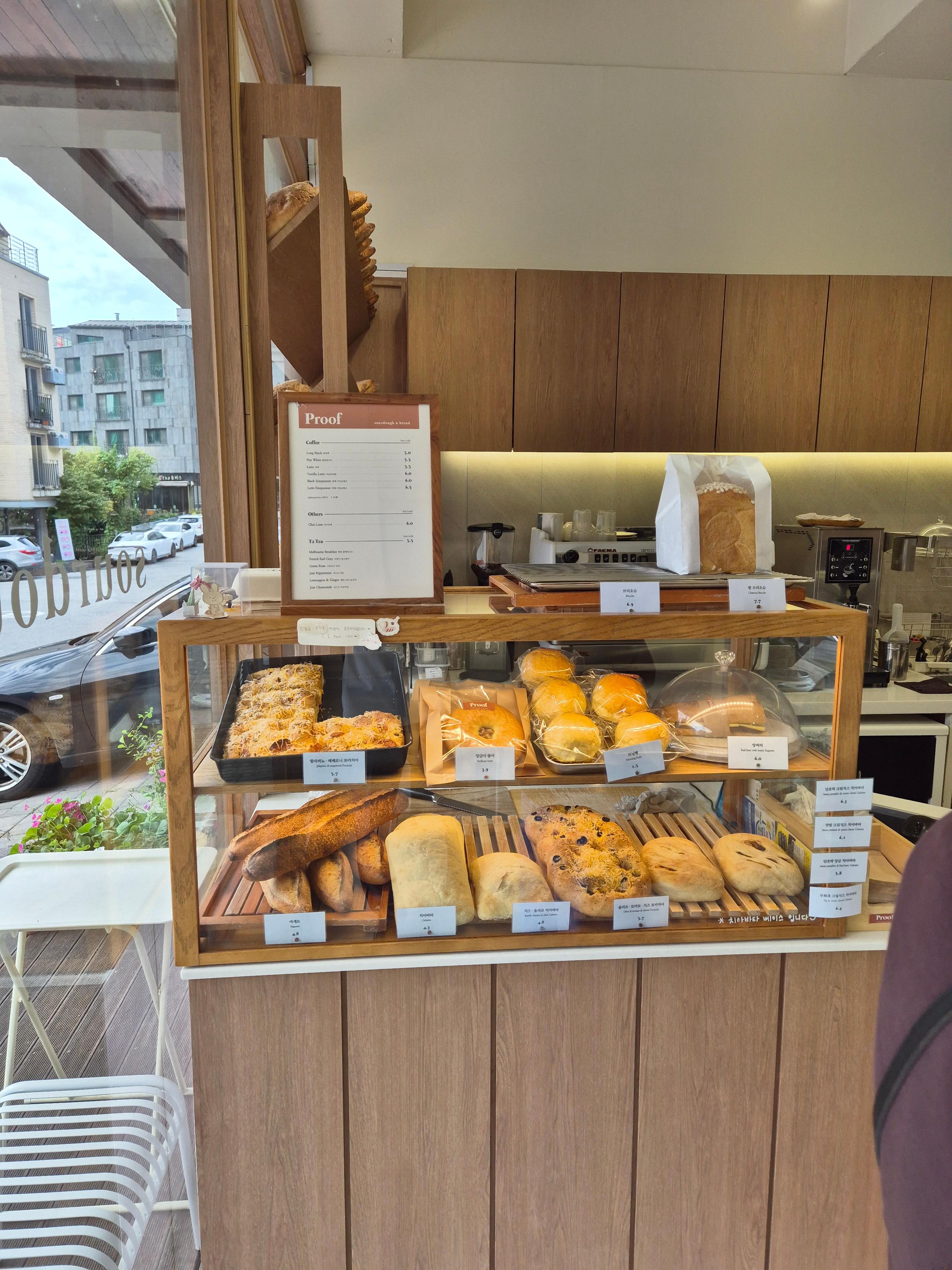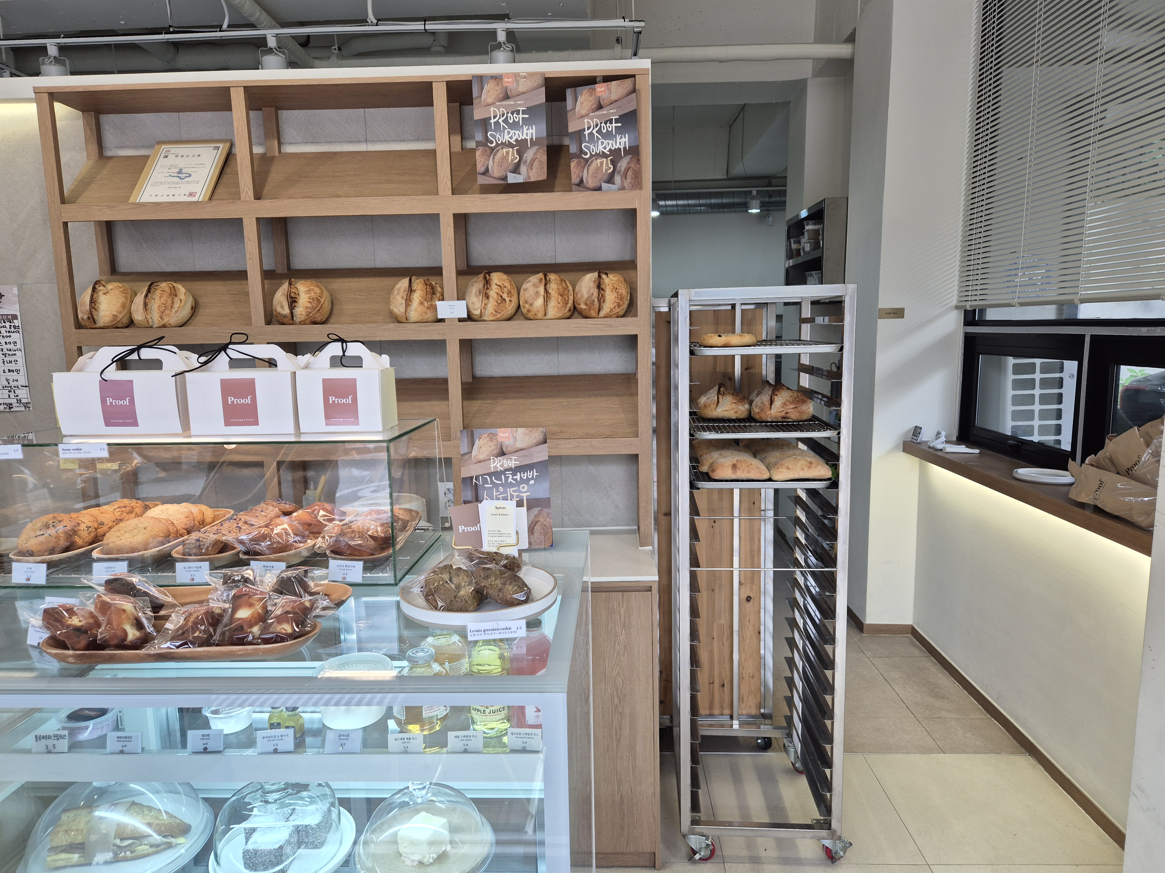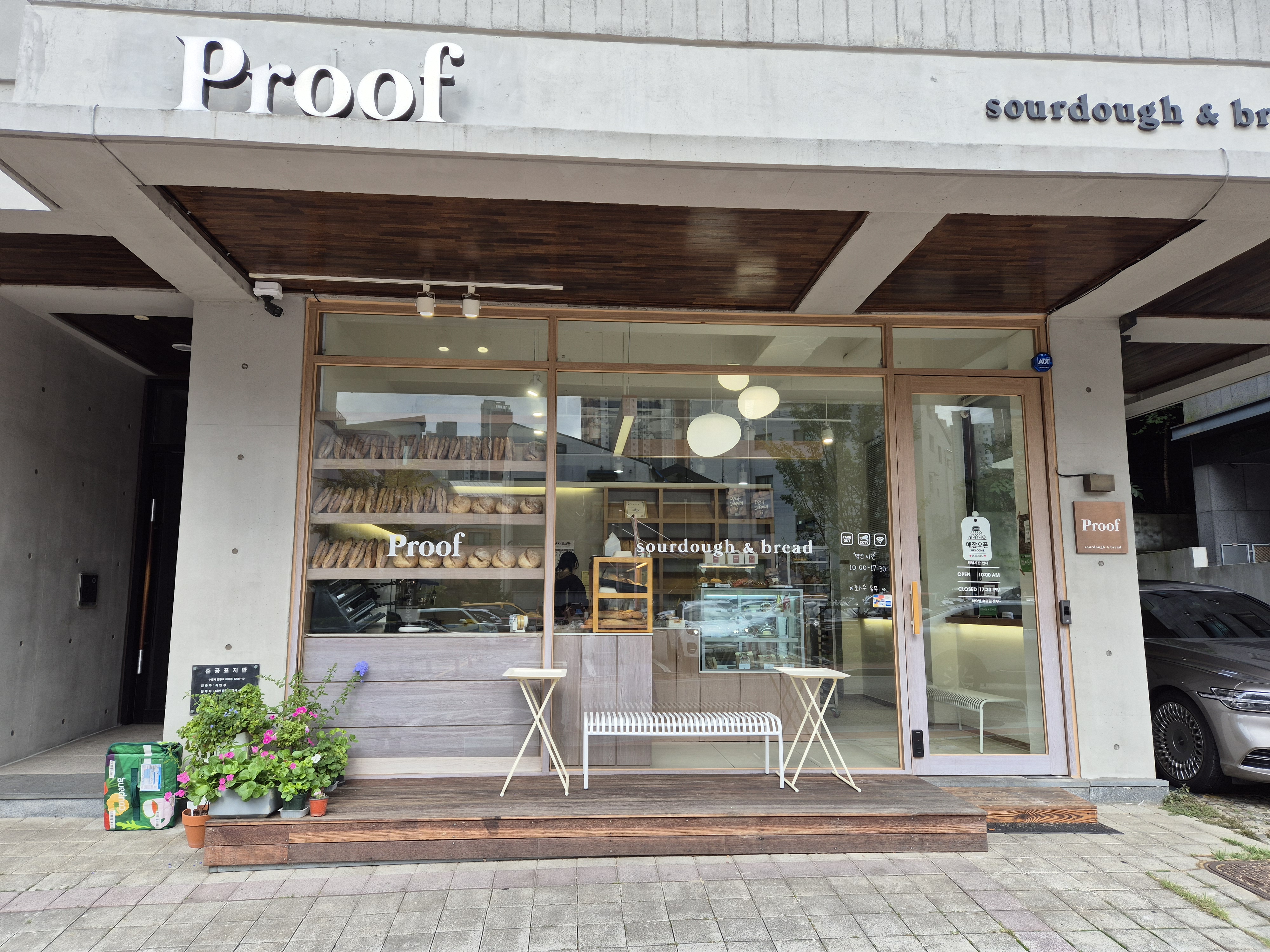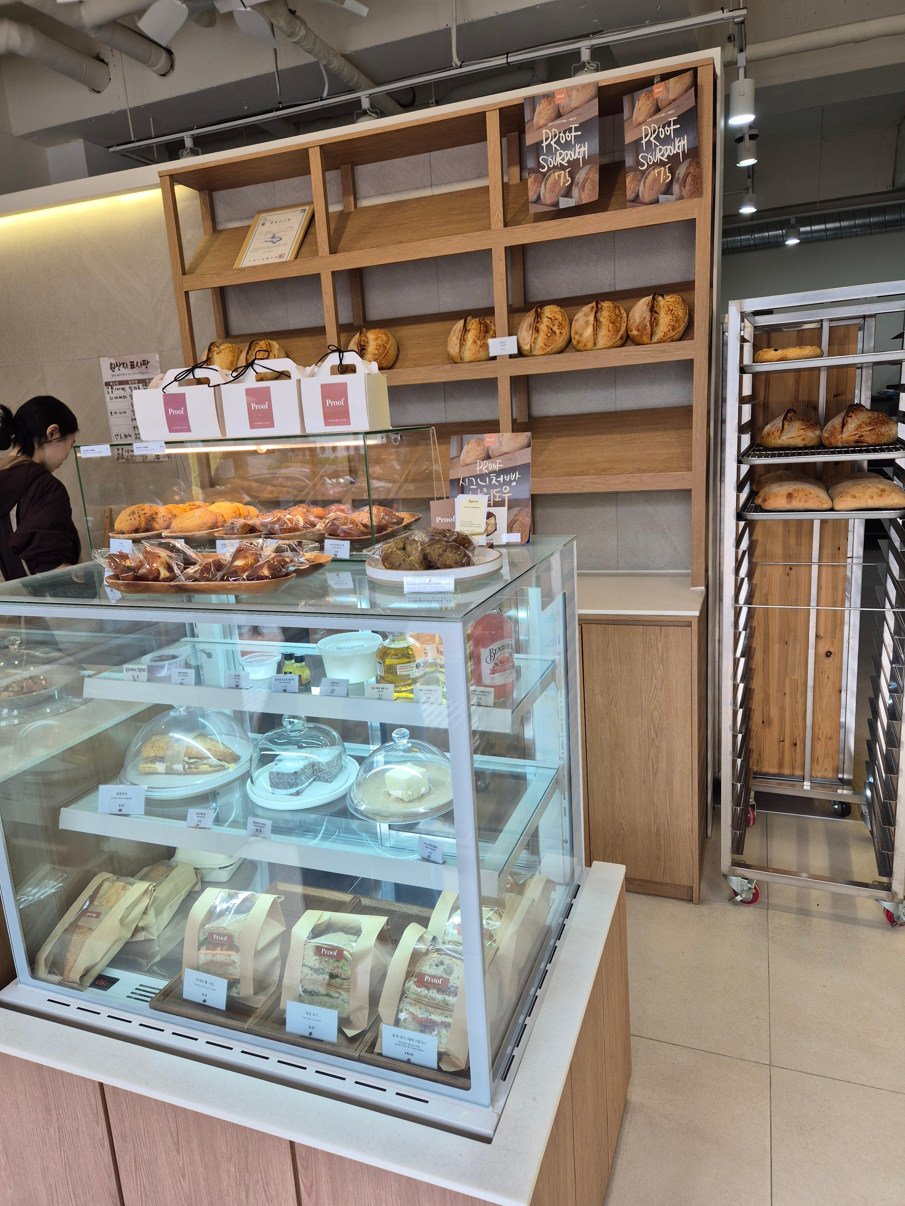 매장 앞에 도착하면, 콘크리트의 모던함과 따뜻한 우드 톤이 어우러진 외관이 먼저 눈에 들어옵니다. 화려하지 않지만, 'Proof'라는 간판에서부터 빵에 대한 진심과 자신감이 느껴지는 것 같아요.